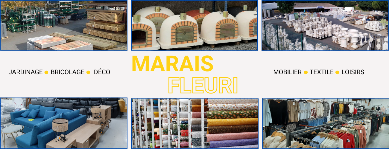 Que vous soyez professionnels ou particuliers, vous trouverez nos rayons de matériaux, d'aménagements extérieur, de bricolage et d’articles pour la maison, de mercerie, de vêtements, vous trouverez forcément votre bonheur au Marais Fleuri.