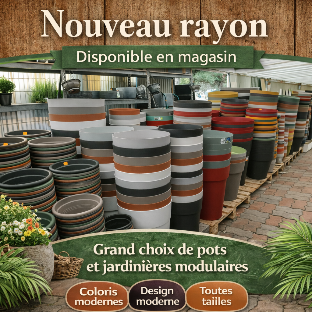 Au Marais Fleuri, nous avons sélectionné pour vous une gamme complète de pots et jardinières modulaires, disponible toute l'année dans nos magasins de Marans et Mareuil-sur-Lay.