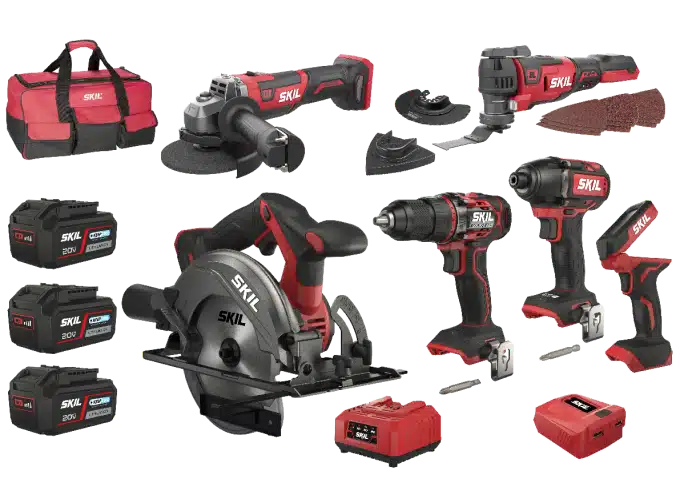 KIT 7 OUTILS 20V BRUSHLESS :Perceuse/visseuse sans fil BRUSHLESS SKIL 3060 + Visseuse à chocs sans fil BRUSHLESS SKIL 3230 + Outil multifonction sans fil BRUSHLESS SKIL 3650 + Scie circulaire sans fil sans charbons SKIL 3550 + Meuleuse d’angle sans fil sans charbons SKIL 3930 + Lampe LED sans fil SKIL 3155 + 3 batteries (Lithium-Ion « 20V Max » de 4,0 Ah) avec technologie « KEEPCOOL™ » + Adaptateur de charge USB sans fil SKIL 3152 .